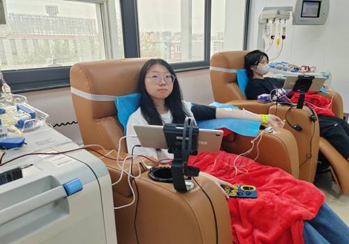 捐献血小板,是救死扶伤志愿奉献行为,在市血液中心采血大厅,志愿者经过体检、采样、血小板检测、上机献血、留观等流程,整个捐献过程长达1.5h,共有10名同学集体完成献血,他们中既有多次参加义务献血的“热血青年”,也有第一次参加义务献血的“志愿新人”,共同用实际行动诠释了汇聚青春正能量,义务献血传爱心的使命担当。