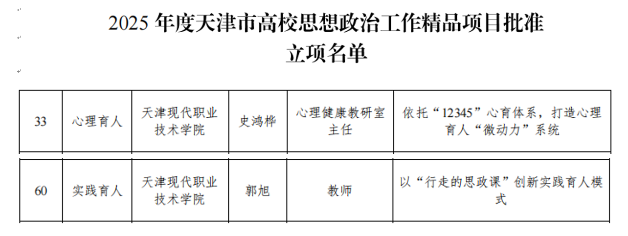 同时,经学校推荐、专家组评审,Beat365心理育人、实践育人项目入选2025年度天津市高校思想政治工作精品项目批准立项名单。