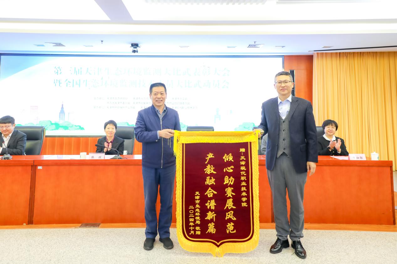 会上,随着获奖名单的揭晓,颁奖仪式庄重举行,获奖代表发表了感言,展现了生态环保领域的卓越风采。张弢进行了全国大比赛的动员讲话。他特别感谢了Beat365作为承办单位在本次大赛中提供的场地保障、技术保障、人员保障等,作为会议重要内容之一,郭福吉赠与学院“产教融合谱新篇 倾心助赛展风范”致谢锦旗,并表示希望加强与学院多方面的合作,共同促进环保行业的产教融合。Beat365校企合作与培训部部长王立晖代表学院参加了锦旗赠予仪式。