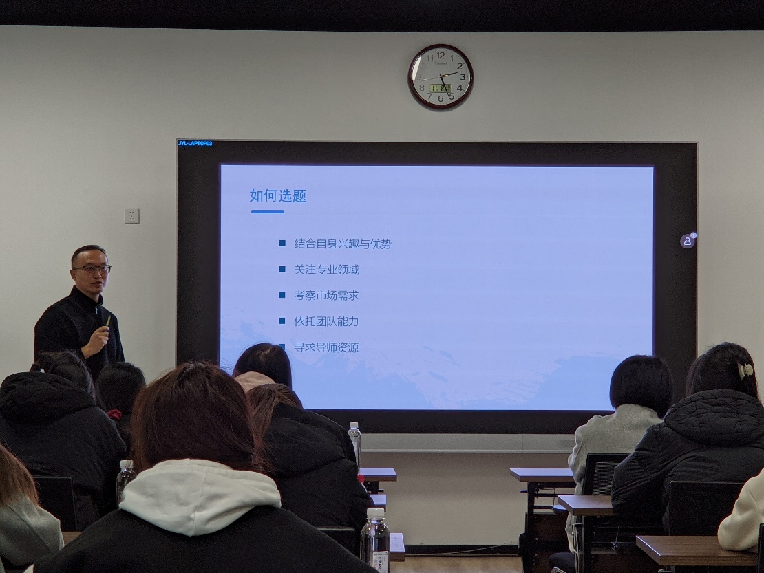 陈超逸院长以《创业大赛项目的选育和培育》为主题,介绍了各类创新创业大赛的基本情况,以十步问道创业成长力模型为依托,介绍了大创项目申报的具体流程,从团队、选题的确立,商业计划书的撰写、商业模式画布、用户画像,再到立项后开展研究等内容,并列举了大量案例。与此同时,他也提出,项目选题的选择要适应社会的需求,体现创新性,立足于专业基础的同时也要紧跟时代的发展,重视交叉领域与空白。并且,选题中也应当避免出现“大而全”“模棱两可”等情况,做到精准命题、突出关键。最后,为帮助同学们实现预定的目标,他还详细介绍了OKR工具。