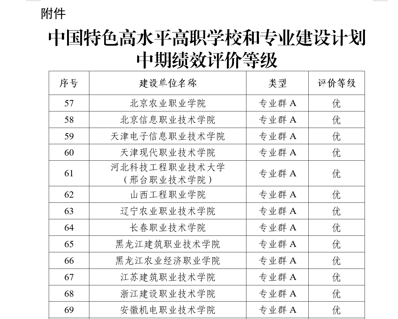 近期,教育部发布“关于中国特色高水平高职学校和专业建设计划中期绩效评价结果的公示”,根据《教育部办公厅 财政部办公厅关于开展中国特色高水平高职学校和专业建设计划中期绩效评价工作的通知》(教职成厅函〔2022〕号)要求,经院校自评、省级评价和两部综合评议等流程,学院在“双高计划”中期绩效评价中获评优秀。