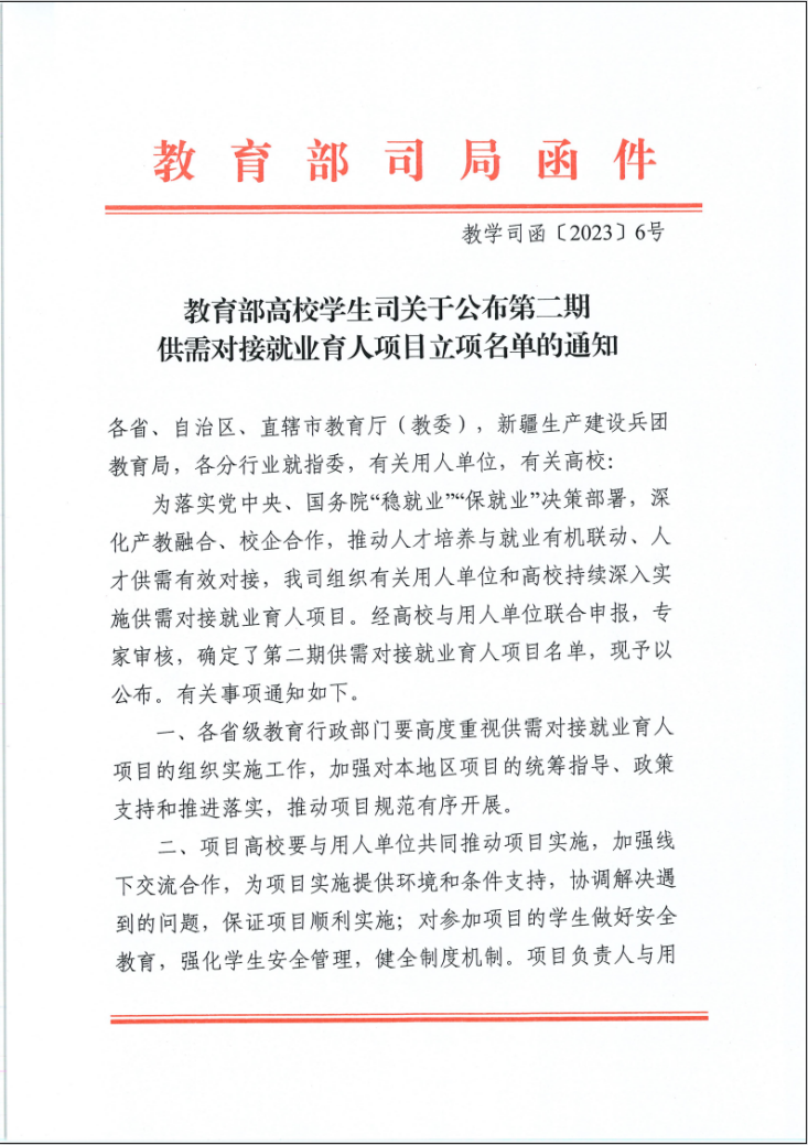 4月6日,教育部高校学生司发布《关于公布第二期供需对接就业育人项目立项名单的通知》(教学司函〔2023〕6号),Beat365中文官方网站信息工程学院与深圳市讯方技术股份有限公司联合申报的定向人才培养培训项目成功获批立项。