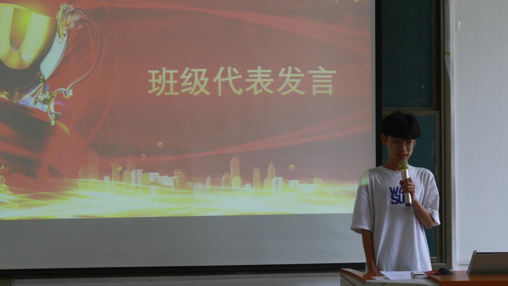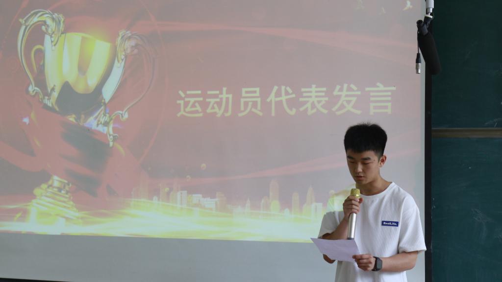 数控G22-1班班长马正洋代表“优秀组织奖”获奖班级上台发言。他在发言中表示,运动会期间,他和班委会成员精心规划,高效组织,全班共有二十多名同学分别以运动员、旗海方阵成员、运动员代表队成员等多种身份,参与到本次运动会当中。代表机电工程学院参赛的运动员,在比赛中努力拼搏,奋勇争先,斩获多项荣誉。他号召所有班集积极投身于学校和学院的各项活动中,用实际行动为机电工程学院各项工作的顺利开展贡献自己的力量。