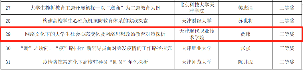 近日,天津市教育两委公布了2022年度天津市高校思想政治工作优秀论文评选活动结果。我校辅导员贾玮和思政课教师王雪纯提交的两篇论文喜获三等奖。