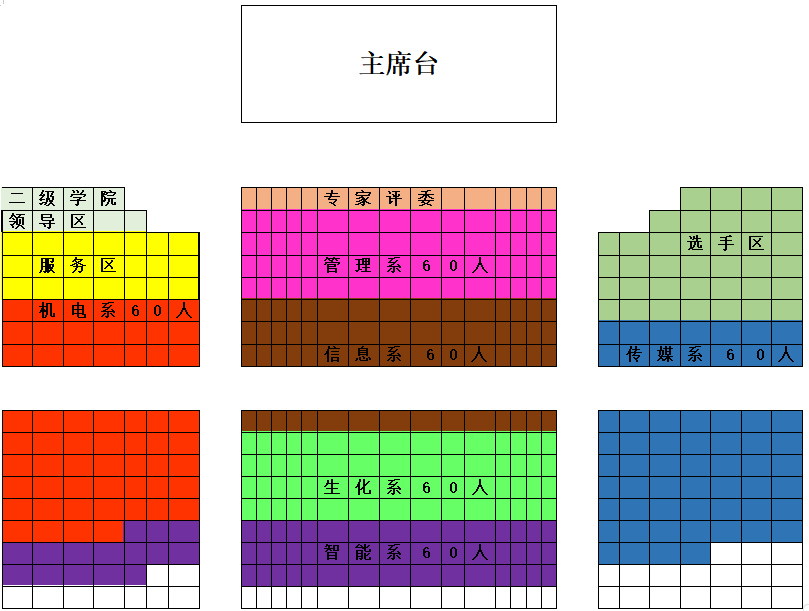 3、请各二级学院组织学生观摩团(各二级学院60人),后附座位图。学生观摩团需提前十五分钟入场。