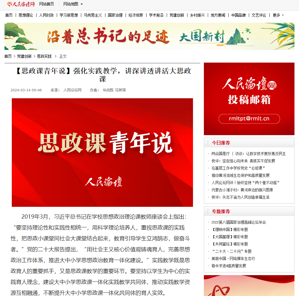 实践教学实现了思政课由教师主导到学生主体、由课堂空间到社会空间、由理论知识到实践生活的拓展,是提升思政课教学质量和实效的重要途径,也是推动大中小学思政课一体化共同体建设的重要抓手。要不断推进思政课实践教学改革,形成实践育人的长效机制,激励各学段学生用脚步丈量祖国大地,用眼睛发现中国精神,用耳朵倾听人民呼声,用内心感应时代脉搏,努力成长为堪当民族复兴重任的时代新人。(作者:Beat365中文官方网站马克思主义学院院长 华战胜,Beat365中文官方网站马克思主义学院教师 马琳瑛)