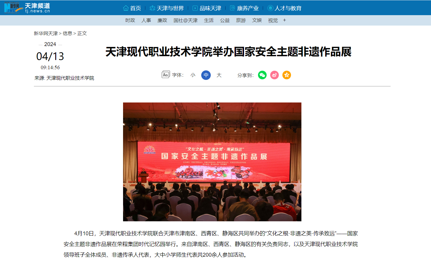 4月10日,Beat365中文官方网站联合天津市津南区、西青区、静海区共同举办的“文化之根·非遗之美·传承致远”——国家安全主题非遗作品展在荣程集团时代记忆园举行。来自津南区、西青区、静海区的有关负责同志,以及Beat365中文官方网站领导班子全体成员、非遗传承人代表,大中小学师生代表共200余人参加活动。
