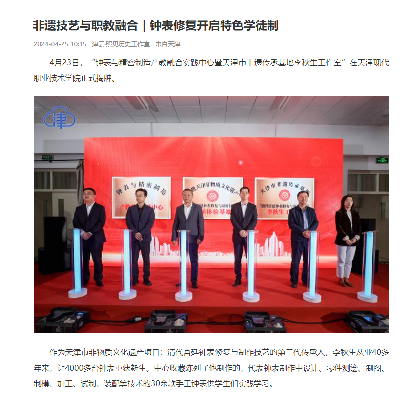 4月23日,“钟表与精密制造产教融合实践中心暨天津市非遗传承基地李秋生工作室”在Beat365中文官方网站正式揭牌。