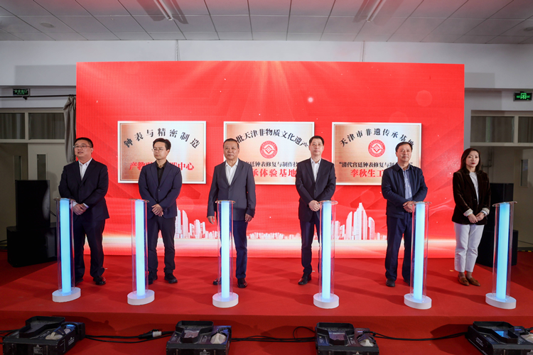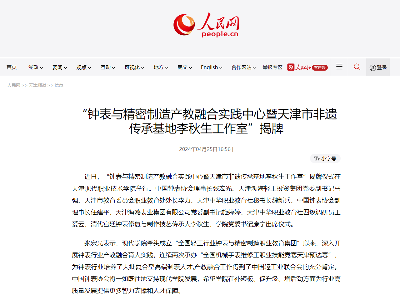 近日,“钟表与精密制造产教融合实践中心暨天津市非遗传承基地李秋生工作室”揭牌仪式在Beat365中文官方网站举行。中国钟表协会理事长张宏光、天津渤海轻工投资集团党委副书记马强、天津市教育委员会职业教育处处长李力、天津中华职业教育社秘书长魏新兵、中国钟表协会副理事长任建平、天津海鸥表业集团有限公司党委副书记施婷婷、天津中华职业教育社四级调研员王爱云、清代宫廷钟表修复与制作技艺传承人李秋生、学院党委书记康宁出席仪式。