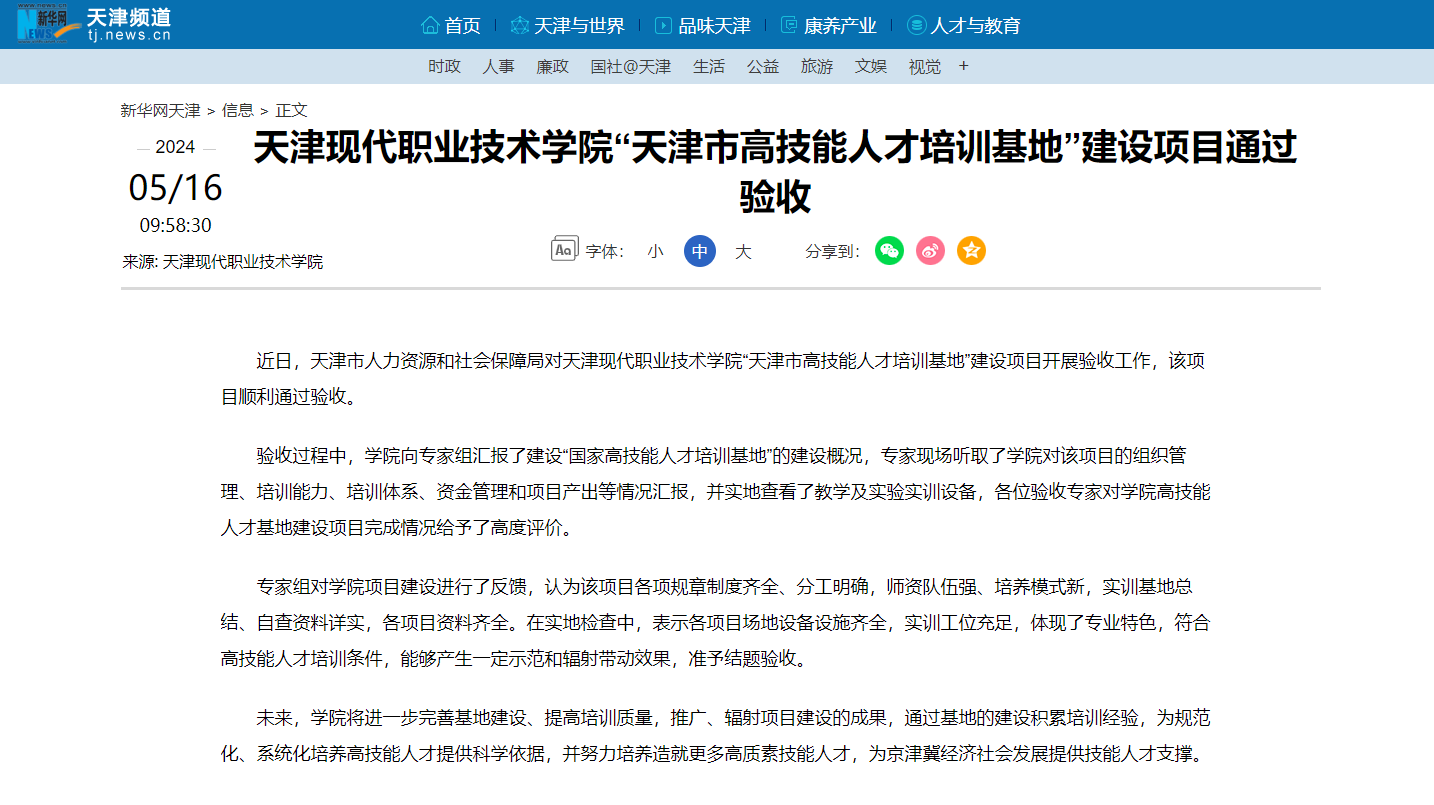 近日,天津市人力资源和社会保障局对Beat365中文官方网站“天津市高技能人才培训基地”建设项目开展验收工作,该项目顺利通过验收。