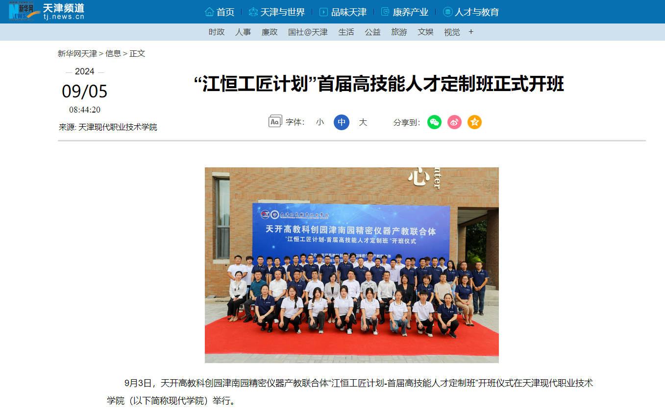 开班仪式上,海河教育园区管委会、江恒产业-天津高端精密仪器产业园以及现代学院领导均表示启动工匠人才定制班,是响应国家关于弘扬工匠精神、加快推进发展职业教育“一体两翼”战略部署,是天开高教科创园津南园精密仪器产教联合体深化产教融合、校企合作的重要举措,通过校企双元育人模式,为学生提供更为精准、更具针对性的职业技能培养。在市域产教联合体平台牵引下,园区、院校、企业将能够产生更多的化学反应,拓展出更多的合作空间,结出更加丰硕的成果,为推动天津高质量发展作出技能人才支撑的贡献。