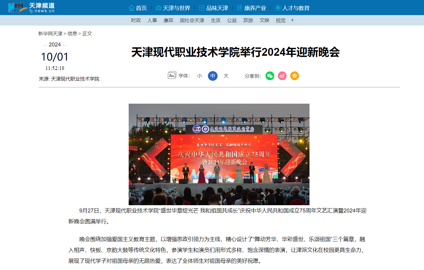 晚会围绕加强爱国主义教育主题,以增强思政引领力为主线,精心设计了“舞动芳华、华彩盛世、乐颂祖国”三个篇章,融入相声、快板、京韵大鼓等传统文化特色,参演学生和演员们用形式多样、饱含深情的表演,让津派文化在校园更具生命力,展现了现代学子对祖国母亲的无限热爱,表达了全体师生对祖国母亲的美好祝愿。