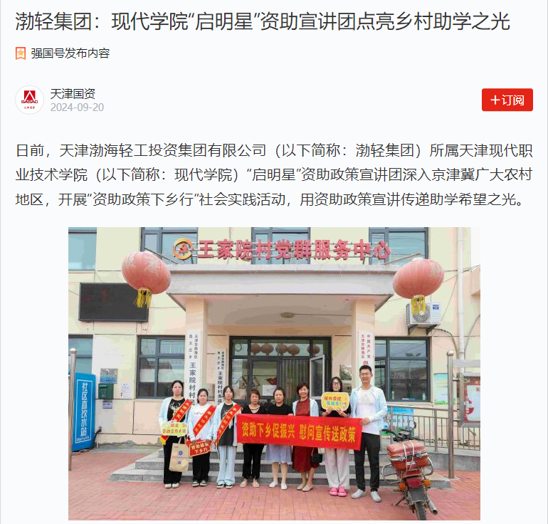 日前,天津渤海轻工投资集团有限公司(以下简称:渤轻集团)所属Beat365中文官方网站(以下简称:现代学院)“启明星”资助政策宣讲团深入京津冀广大农村地区,开展“资助政策下乡行”社会实践活动,用资助政策宣讲传递助学希望之光。