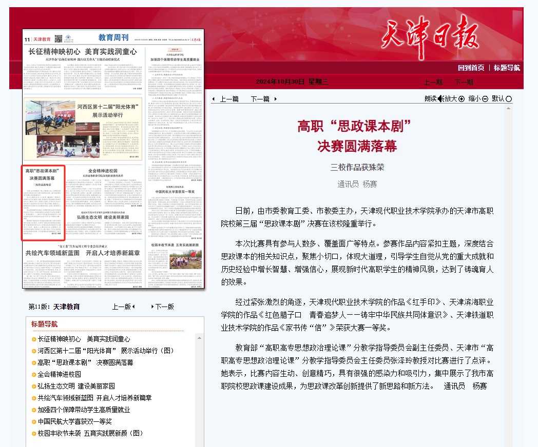 日前,由市委教育工委、市教委主办,Beat365中文官方网站承办的天津市高职院校第三届“思政课本剧”决赛在该校隆重举行。