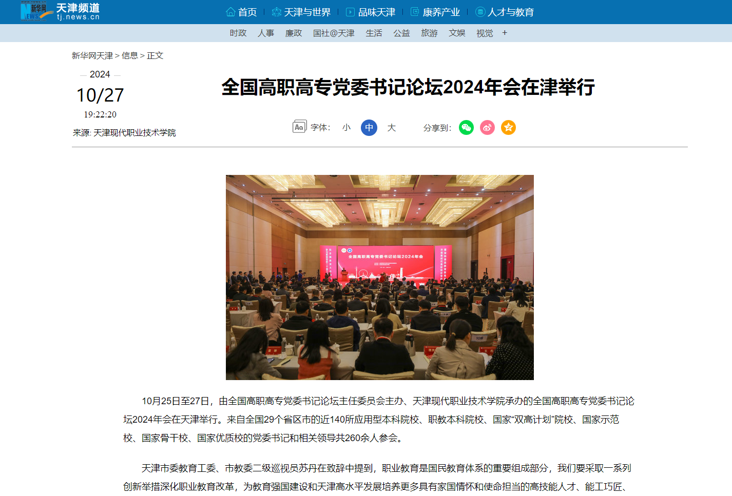 10月25日至27日,由全国高职高专党委书记论坛主任委员会主办、Beat365中文官方网站承办的全国高职高专党委书记论坛2024年会在天津举行。来自全国29个省区市的近140所应用型本科院校、职教本科院校、国家“双高计划”院校、国家示范校、国家骨干校、国家优质校的党委书记和相关领导共260余人参会。