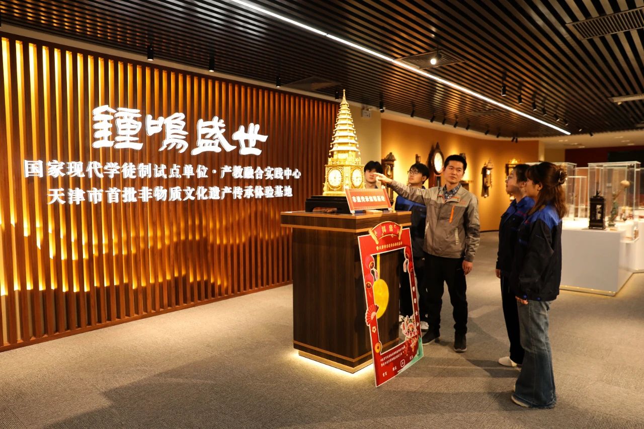 在“钟鸣盛世”天津市首批非物质文化遗产传承体验基地,天津市清代古钟表非遗传承人李秋生大师,正带领学生进行清代宫廷钟表修复与制作技艺的学习。这里近40 件珍贵展品都是钟表艺术的瑰宝,学生们不仅学习到修复古钟表的技艺,更深刻体会到了钟表中蕴含的中华优秀传统文化。