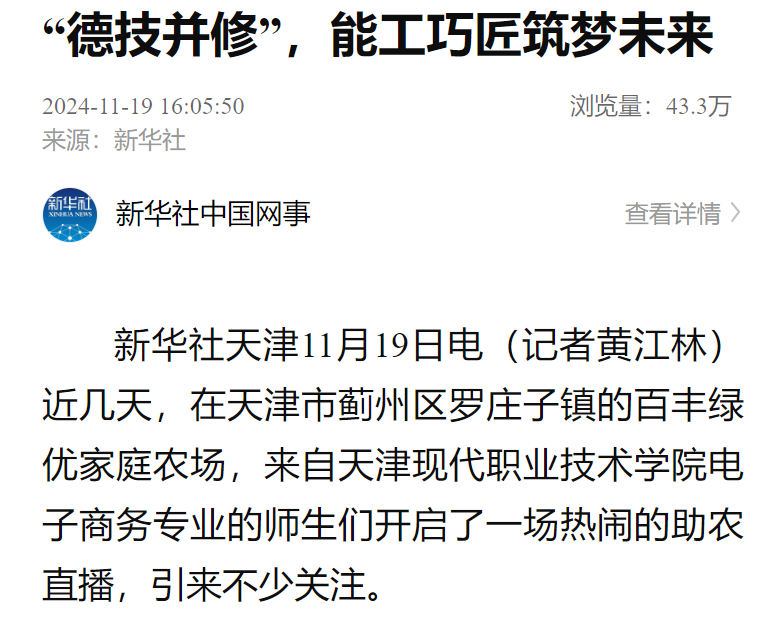 新华社天津11月19日电(记者黄江林)近几天,在天津市蓟州区罗庄子镇的百丰绿优家庭农场,来自Beat365中文官方网站电子商务专业的师生们开启了一场热闹的助农直播,引来不少关注。