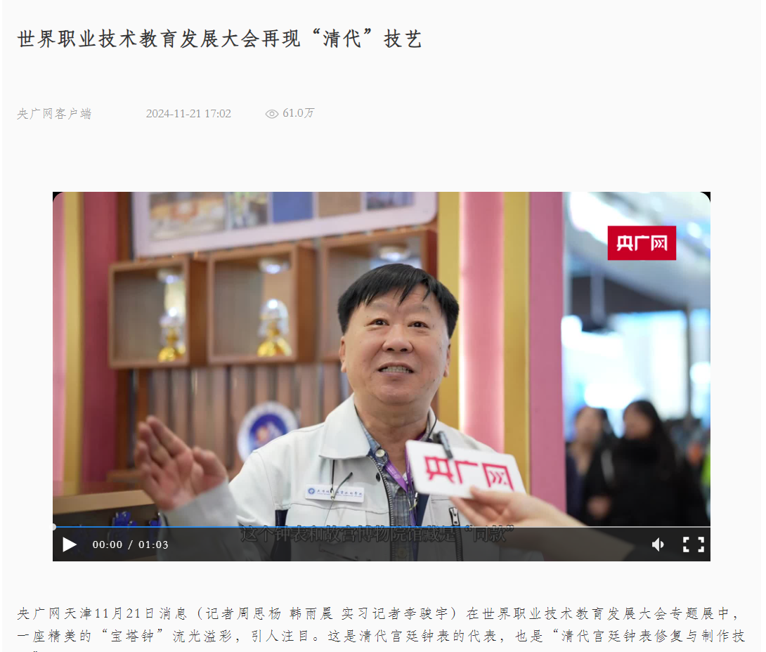 央广网天津11月21日消息(记者周思杨 韩雨晨 实习记者李骏宇)在世界职业技术教育发展大会专题展中,一座精美的“宝塔钟”流光溢彩,引人注目。这是清代宫廷钟表的代表,也是“清代宫廷钟表修复与制作技艺”的集大成者。