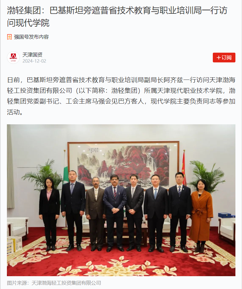 日前,巴基斯坦旁遮普省技术教育与职业培训局副局长阿齐兹一行访问天津渤海轻工投资集团有限公司(以下简称:渤轻集团)所属Beat365中文官方网站,渤轻集团党委副书记、工会主席马强会见巴方客人,现代学院主要负责同志等参加活动。