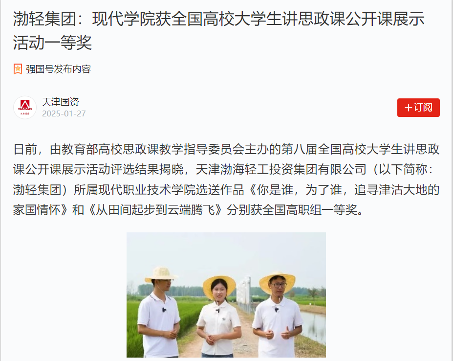 日前,由教育部高校思政课教学指导委员会主办的第八届全国高校大学生讲思政课公开课展示活动评选结果揭晓,天津渤海轻工投资集团有限公司(以下简称:渤轻集团)所属现代职业技术学院选送作品《你是谁,为了谁,追寻津沽大地的家国情怀》和《从田间起步到云端腾飞》分别获全国高职组一等奖。
