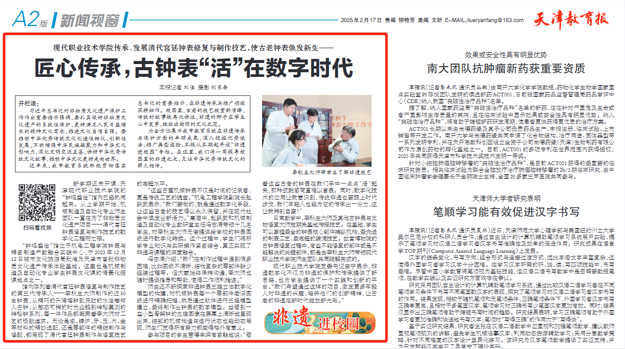 “这些古董机械钟表不仅是时间的记录者,更是传统工艺的瑰宝。”机电工程学院副院长赵跃武表示,“我们要做的,就是通过数字化手段, 让这些古老的技艺得以永久保留,并在现代社会中焕发出新活力。”寒假中,赵跃武和机械制 造及自动化专业教研室主任冯志清带领十几名学生,对李秋生大师无偿提供给学校的钟表图纸进行数字化转换。这个过程中,学生们将所学专业知识与实际操作紧密结合,真正实现了非遗与课程的深度融合。