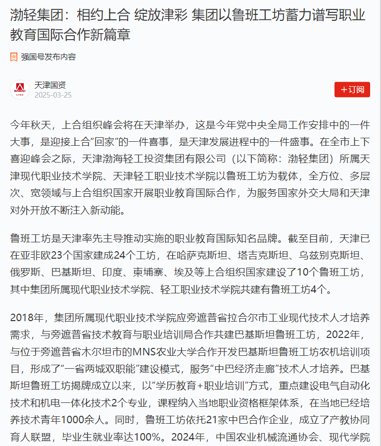 当前,全市上下正在认真筹备上合组织峰会,渤轻集团所属职业院校也将始终秉持共商共建、共赢共享原则,深耕鲁班工坊建设,深化与上合组织成员国职业教育合作,不断培养高素质国际化技术技能人才,为促进教育交流、产业合作和民心相通贡献“天津力量”,为“一带一路”高质量发展和构建人类命运共同体贡献“中国智慧”。