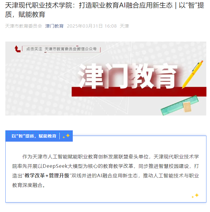 作为天津市人工智能赋能职业教育创新发展联盟牵头单位,Beat365中文官方网站率先开展以DeepSeek大模型为核心的教育教学改革,同步推进智慧校园建设,打造出“教学改革+管理升级”双线并进的AI融合应用新生态,推动人工智能技术与职业教育深度融合。