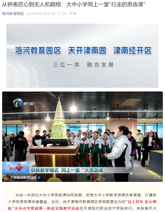 天津市优秀教育工作者、天津市五一劳动奖章获得者、南开大学马克思主义学院刘一博老师指出,本次课程是对大中小学思政课一体化建设的有力探索,突破了以往仅将“一体化”局限于教师团队中的定势,为思政课一体化建设提供了可供参考的范本。今后,海河教育园区管委会将进一步发挥服务职能,深化产教融合,拓展思政教育新维度,凝聚大中小一体化思政教学合力,增强院校互动、校企联动,为科教兴市、人才强市注入思政动能,开创思政工作高质量发展新局面。