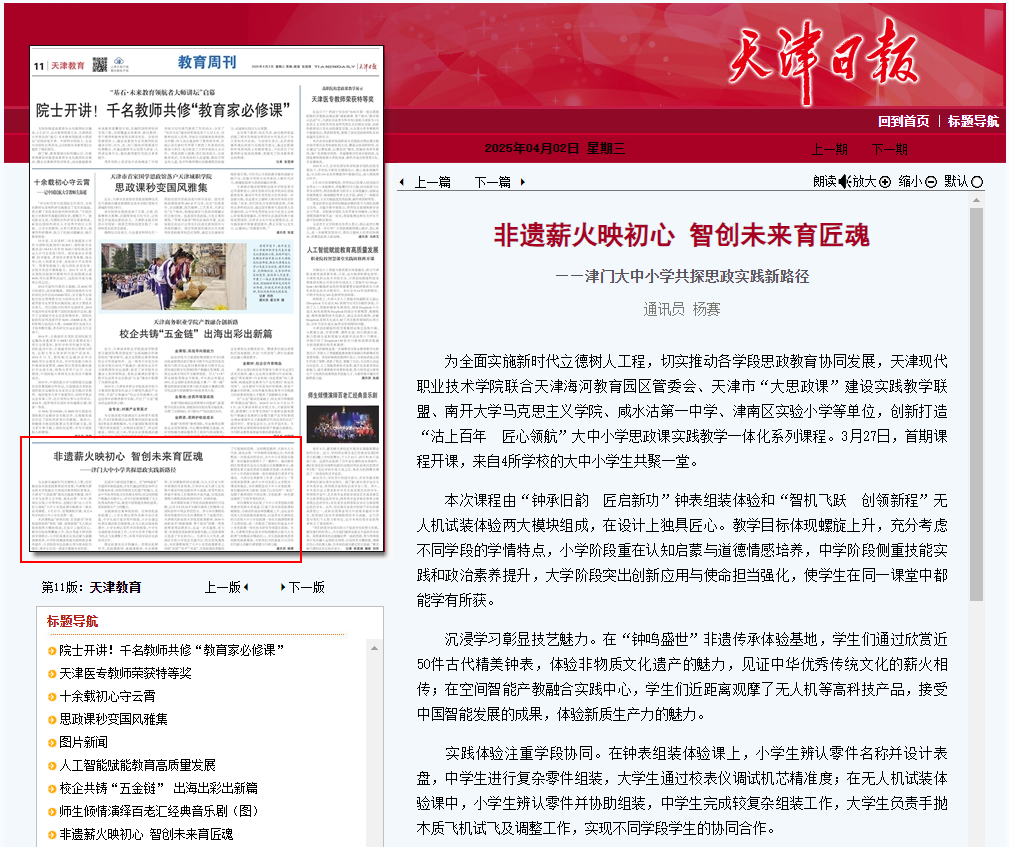 本次课程突破了传统思政教育的时空局限,让学子们在动手实践中感悟工匠精神,在团队协作中领会责任担当。参与本次课程的领导和教师均对本次课程给予了高度评价。Beat365中文官方网站思政课教师、2024年高职高专“萌新磨课 骨干练兵”国赛一等奖获得者周业群表示,这是一次有温度、有力度、有深度的思政教育创新实践,让思政课真正走进了学生的内心。天津市人大代表、津南区实验小学党总支副书记、校长张凤瑰指出,本次课程体现了大中小学思政课教育之间的“共情”“共声”“共享”,为思政课改革提供了可复制的范例。全国模范教师、天津市人大代表、咸水沽第一中学教师刘春艳认为,本次课程是一次很成功的尝试,为大中小学思政实践课一体化蓬勃发展种下了一颗种子。海河教育园区管理委员会办公室副主任郎静静表示,海教园有着丰富的思政实践教学资源,未来将在大中小学思政实践课一体化领域进行更多开发建设。天津市优秀教育工作者、天津市五一劳动奖章获得者、南开大学马克思主义学院刘一博老师指出,本次课程是对大中小学思政课一体化建设的有力探索,突破了以往仅将“一体化”局限于教师团队中的定势,为思政课一体化建设提供了可供参考的范本。
