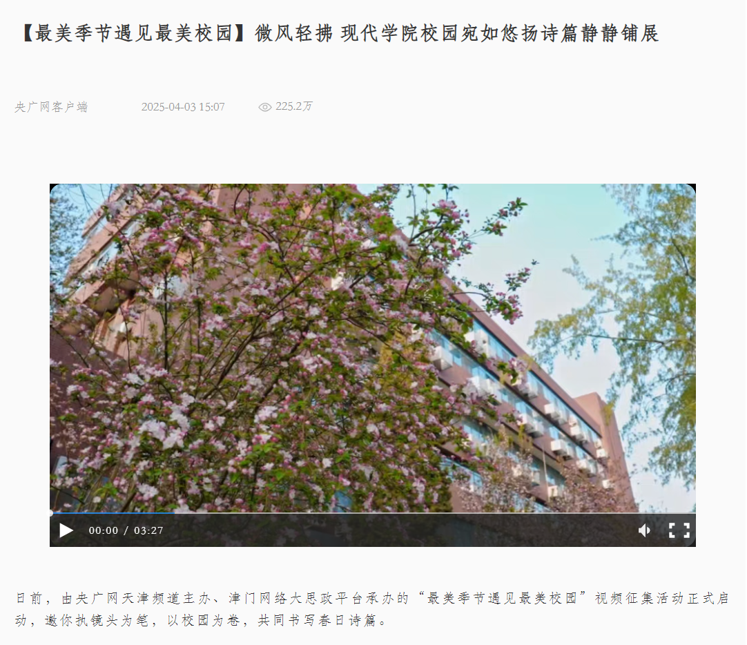 日前,由央广网天津频道主办、津门网络大思政平台承办的“最美季节遇见最美校园”视频征集活动正式启动,邀你执镜头为笔,以校园为卷,共同书写春日诗篇。