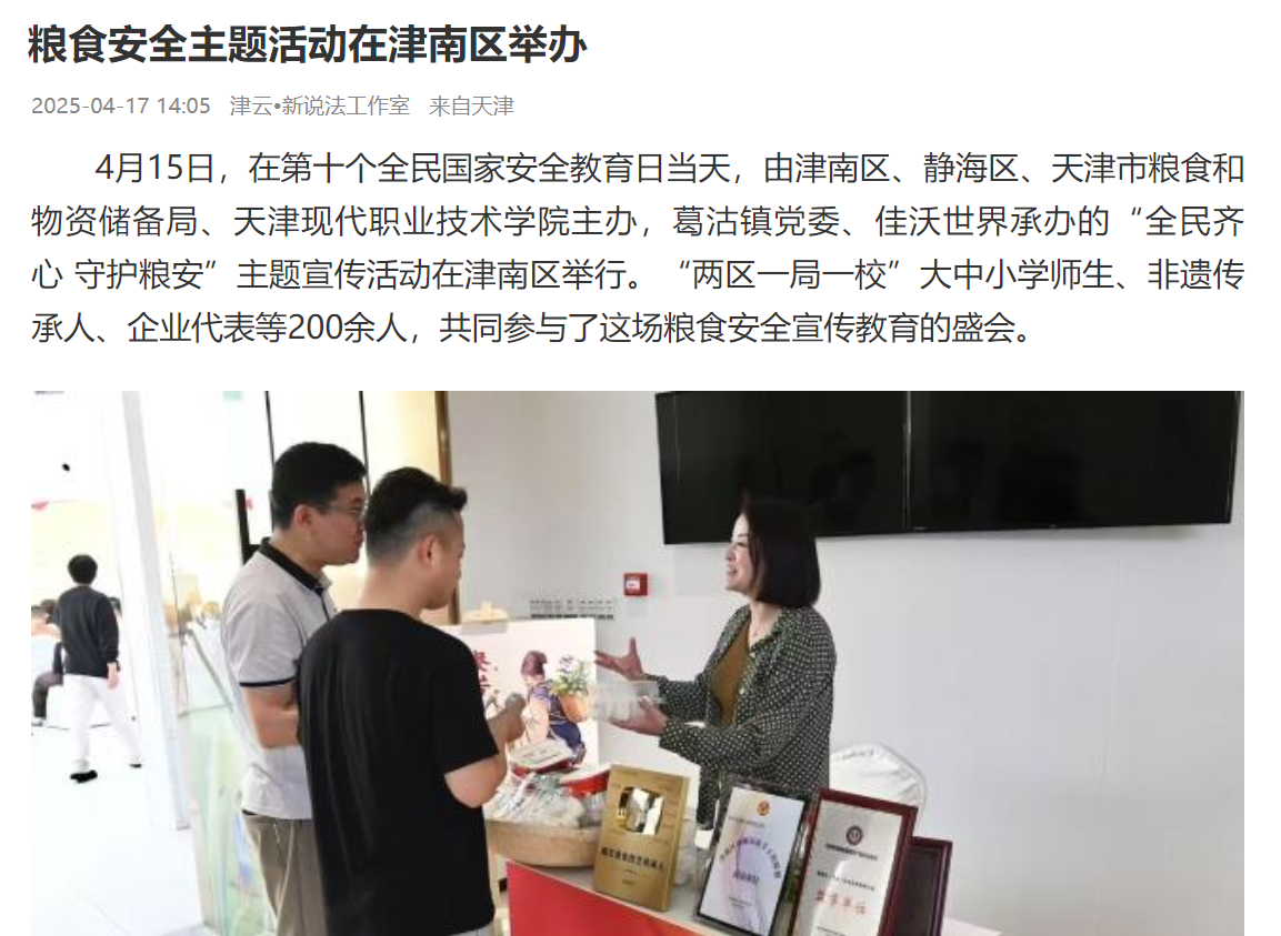 4月15日,在第十个全民国家安全教育日当天,由津南区、静海区、天津市粮食和物资储备局、Beat365中文官方网站主办,葛沽镇党委、佳沃世界承办的“全民齐心 守护粮安”主题宣传活动在津南区举行。“两区一局一校”大中小学师生、非遗传承人、企业代表等200余人,共同参与了这场粮食安全宣传教育的盛会。