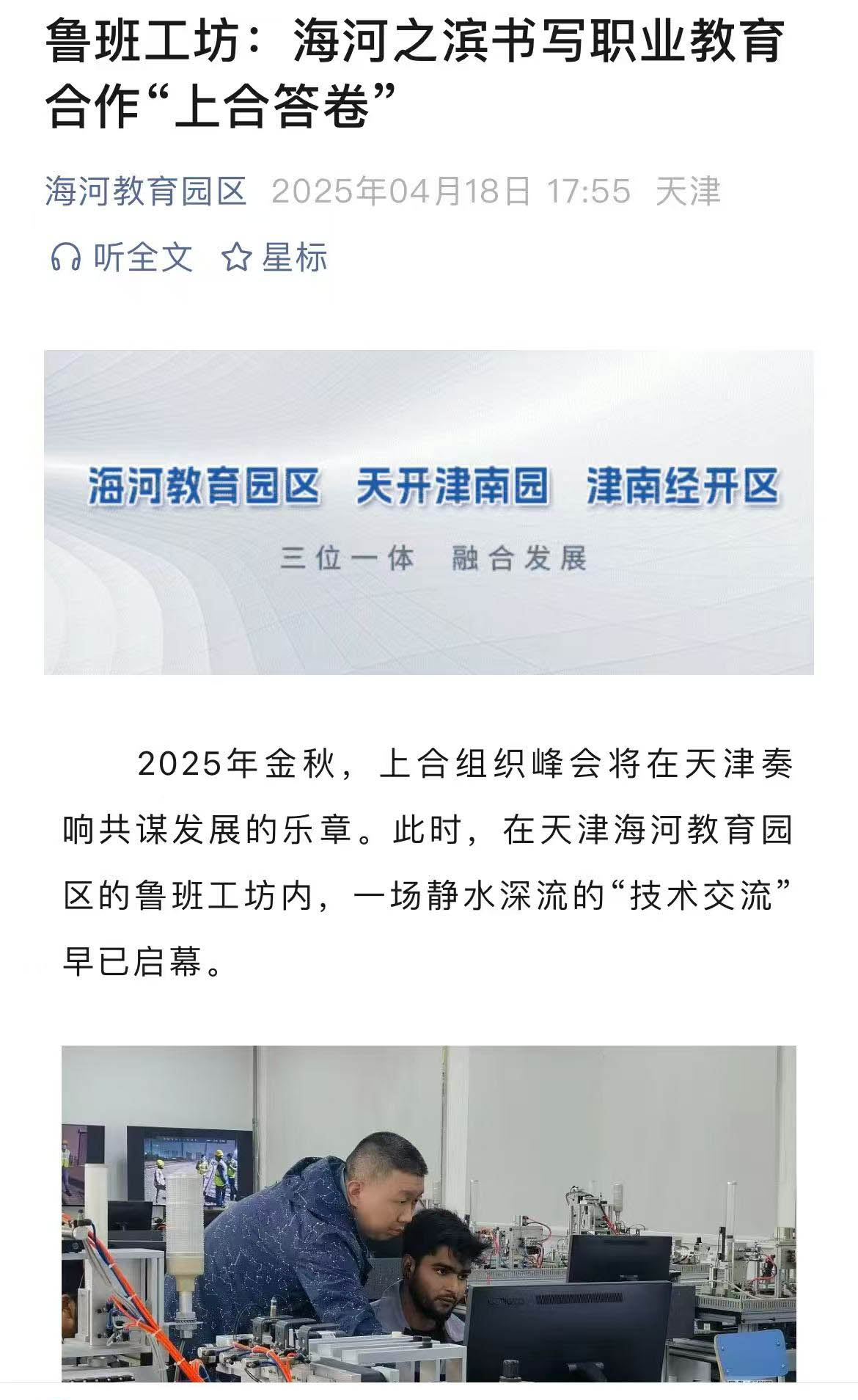 2025年金秋,上合组织峰会将在天津奏响共谋发展的乐章。此时,在天津海河教育园区的鲁班工坊内,一场静水深流的“技术交流”早已启幕。