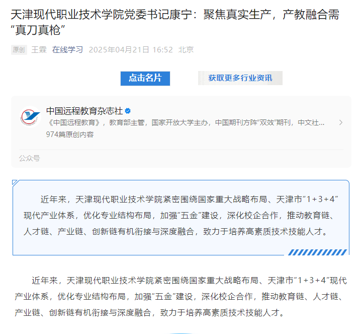 康宁:学院紧密对接天津市智能科技、生物医药、新能源、新材料、航空航天、装备制造等六大产业,以高素质技术技能人才培养为核心,以市域产教联合体、行业产教融合共同体、特色产业学院为引擎,进行了多方面的实践和探索。
