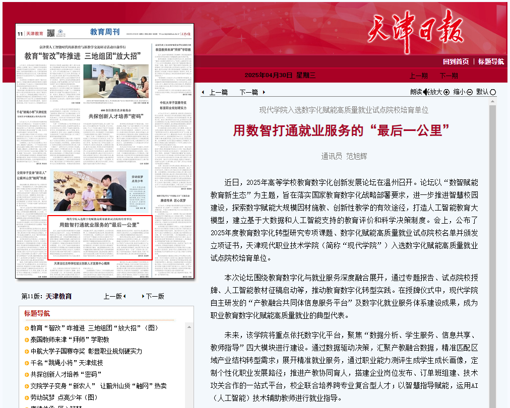 现代学院还将以此次入选数字化赋能高质量就业试点培育单位为契机,进一步发挥产教融合信息服务平台优势,深化与天津市“1+3+4”现代产业体系对接,推动专业建设与产业需求同频共振,加速推进教育链、人才链与产业链、创新链的深度融合,通过数字技术打通就业服务的“最后一公里”,为培育大国工匠、能工巧匠和高技能人才提供可复制、可推广的数字化服务模式,助力职业教育高质量发展。