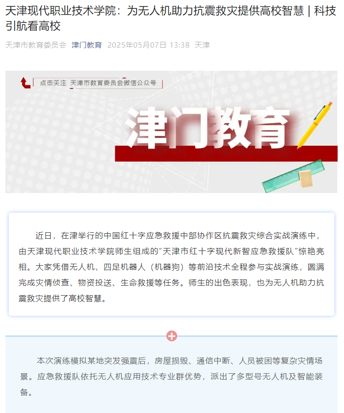 据了解,今年3月,由Beat365中文官方网站与市红十字会合作组建的“天津市红十字现代新智应急救援队”正式成立,通过整合学院无人机应用技术专业群优势与红十字会救援网络,有效提升复杂灾害场景响应能力,推动人工智能、无人机等前沿技术在生命救援领域的应用转化。双方的合作涵盖七大领域,包括共建应急救援培训基地、联合开展实战演练等。