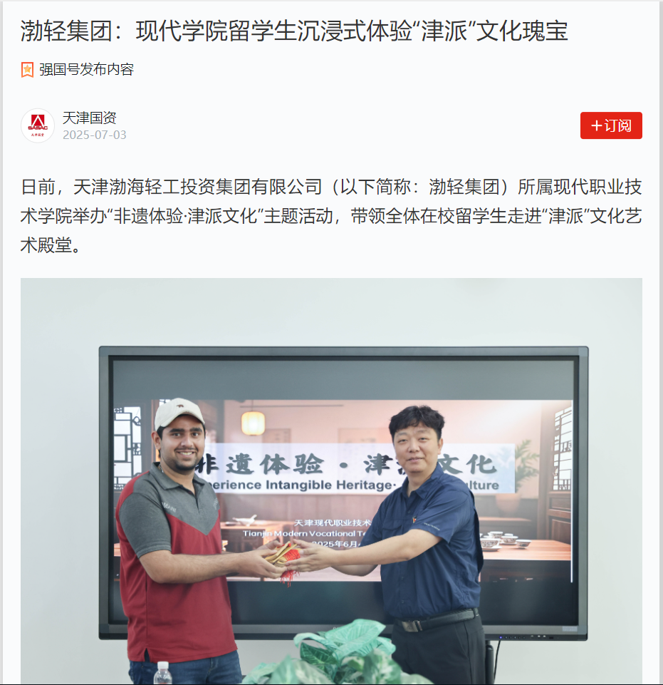日前,天津渤海轻工投资集团有限公司(以下简称:渤轻集团)所属现代职业技术学院举办“非遗体验·津派文化”主题活动,带领全体在校留学生走进“津派”文化艺术殿堂。