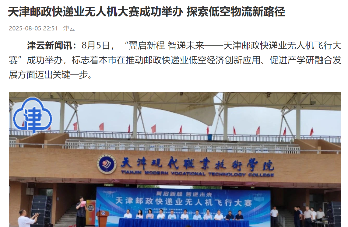 津云新闻讯:8月5日,“翼启新程 智递未来——天津邮政快递业无人机飞行大赛”成功举办,标志着本市在推动邮政快递业低空经济创新应用、促进产学研融合发展方面迈出关键一步。