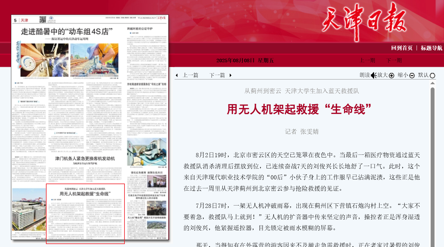 那天,当得知有在外露营的游客因来不及撤走急需救援时,正在老家过暑假的刘俊兴立刻带着无人机加入蓝天救援队。经过两个多小时搜寻,他在屏幕上发现了爬到树上躲避洪水的游客。他立即通过无人机喊话安抚,引导他们等待冲锋舟救援。最终,两名被困游客成功脱险。