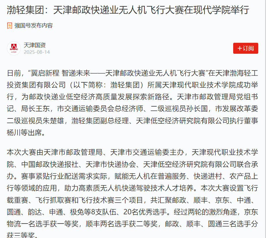 据悉,无人机快递作为“低空经济+现代物流”的典型场景,已成为行业转型升级的关键抓手。本次赛事不仅展示了无人机在邮政快递领域的前沿技术,更为未来发展提供了明确方向,充分展现了无人机产学研用结合模式的创新成果。未来,集团将充分发挥现代学院教育教学优势,通过低空经济研究院有限公司,在产教融合、科技创新、人才培养等方面持续发力,为共同推进无人机技术在邮政快递领域的场景落地和我市低空经济高质量发展注入强劲动力,成为“智慧城市”建设的关键一环。