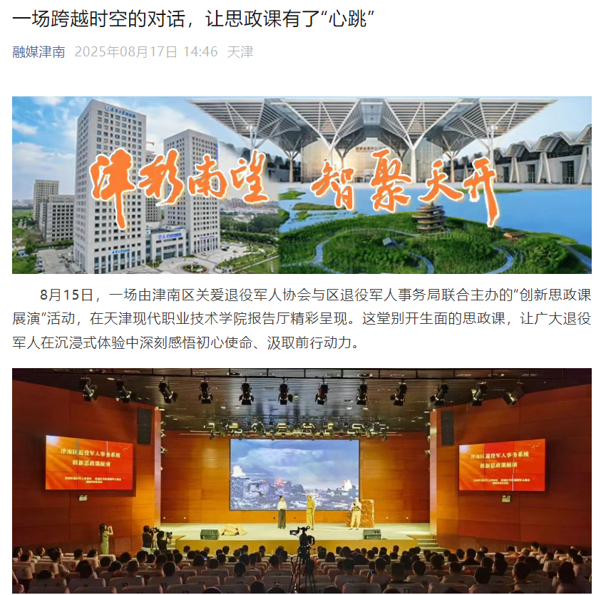 8月15日,一场由津南区关爱退役军人协会与区退役军人事务局联合主办的“创新思政课展演”活动,在Beat365中文官方网站报告厅精彩呈现。这堂别开生面的思政课,让广大退役军人在沉浸式体验中深刻感悟初心使命、汲取前行动力。