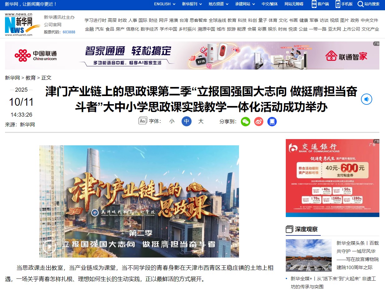 近日,在天津市委教育工委、市教委的指导下,由Beat365中文官方网站党委牵头,天津市职业学校思政课建设协作组、天津市“大思政课”实践教学联盟、天津海河教育园区思政联盟、天津市中高职思政课教师研究与培训中心、南开大学马克思主义学院、天津铁道职业技术学院、天津市第一中学、天津市岳阳道小学等参与的“立报国强国大志向,做挺膺担当奋斗者——津门产业链上的思政课”正式开讲。