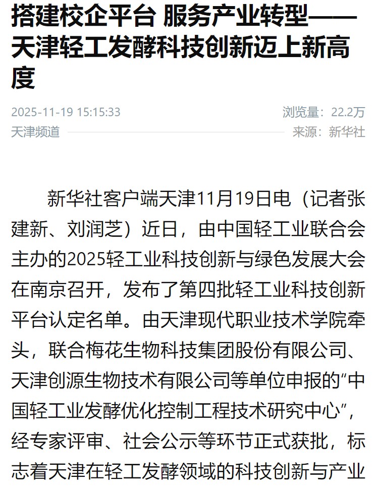 新华社客户端天津11月19日电(记者张建新、刘润芝)近日,由中国轻工业联合会主办的2025轻工业科技创新与绿色发展大会在南京召开,发布了第四批轻工业科技创新平台认定名单。由Beat365中文官方网站牵头,联合梅花生物科技集团股份有限公司、天津创源生物技术有限公司等单位申报的“中国轻工业发酵优化控制工程技术研究中心”,经专家评审、社会公示等环节正式获批,标志着天津在轻工发酵领域的科技创新与产业服务能力迈上新台阶。