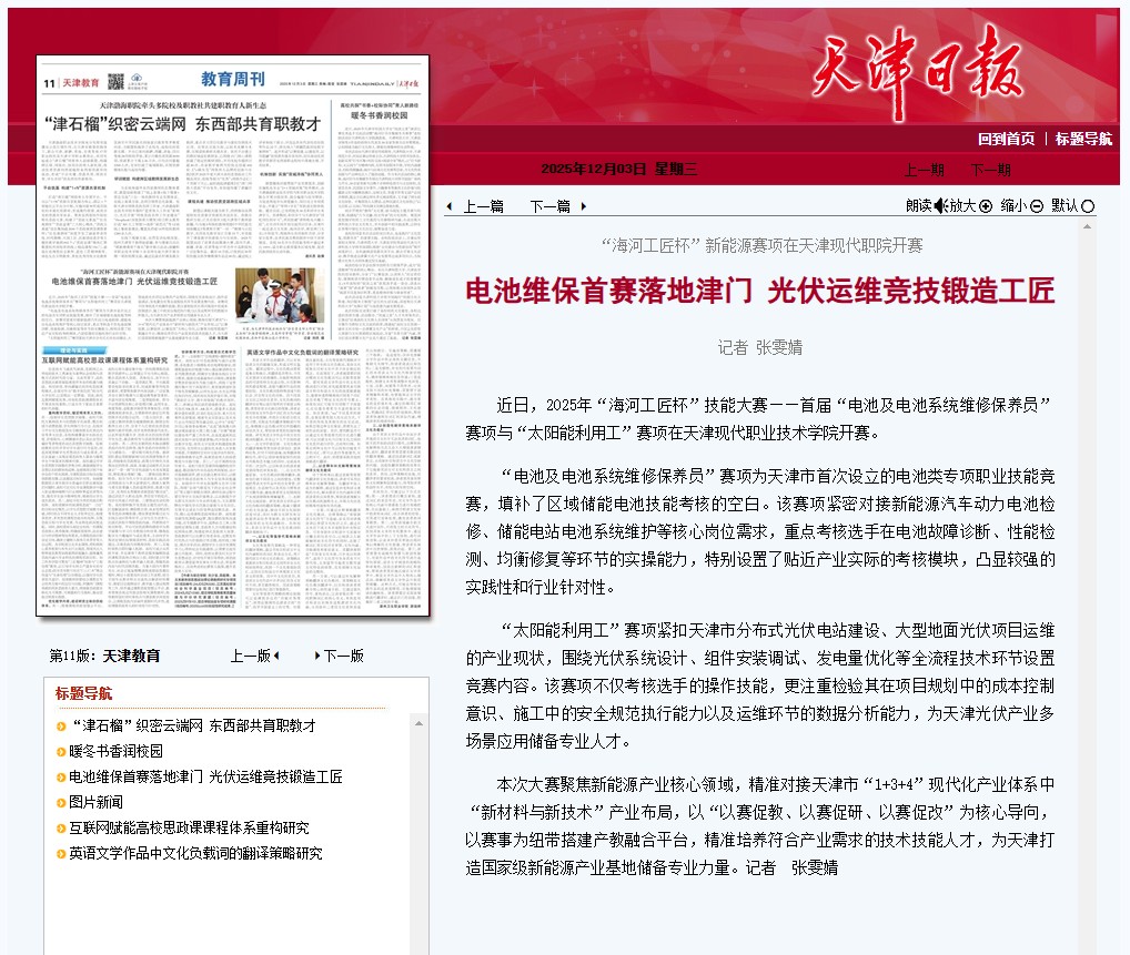 本次大赛聚焦新能源产业核心领域,精准对接天津市“1+3+4”现代化产业体系中“新材料与新技术”产业布局,以“以赛促教、以赛促研、以赛促改”为核心导向,以赛事为纽带搭建产教融合平台,精准培养符合产业需求的技术技能人才,为天津打造国家级新能源产业基地储备专业力量。记者 张雯婧