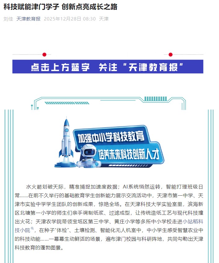 水火箭划破天际,精准捕捉加速度数据;AI系统悄然运转,智能打理班级日常……在前不久举行的基础教育学生创新能力展示交流活动中,天津市第一中学、天津市实验中学学生团队的创新成果,惊艳全场。在天津科技大学实验室里,滨海新区北塘第一小学的师生们亲手调制纸浆、过滤成型,让传统造纸工艺与现代科技撞出火花;天津农学院带领宝坻区第三中学、黄庄小学等多所中小学校走进小站稻科技小院,在种子“体检”、土壤检测、智能化无人机室中,中小学生感受智慧农业中的科技动能……一幕幕生动鲜活的场景,遍布津门校园与科研阵地,共同勾勒出天津科技教育的蓬勃图景。