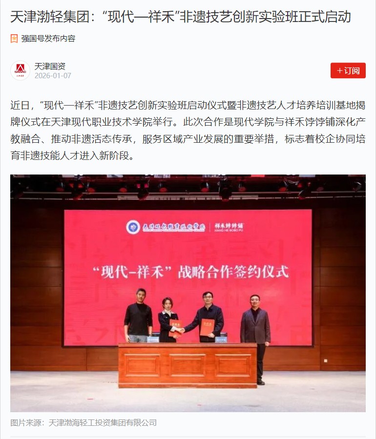 此次活动是职业教育与非遗传承深度融合的生动实践,也是校企协同育人的创新探索。未来,学院将与企业一道以实验班为纽带,持续深化产教融合,在非遗技艺传承、技术创新、人才培养等方面协同发力,让非遗文化薪火相传,为区域经济和产业发展贡献“现代—祥禾”力量。
