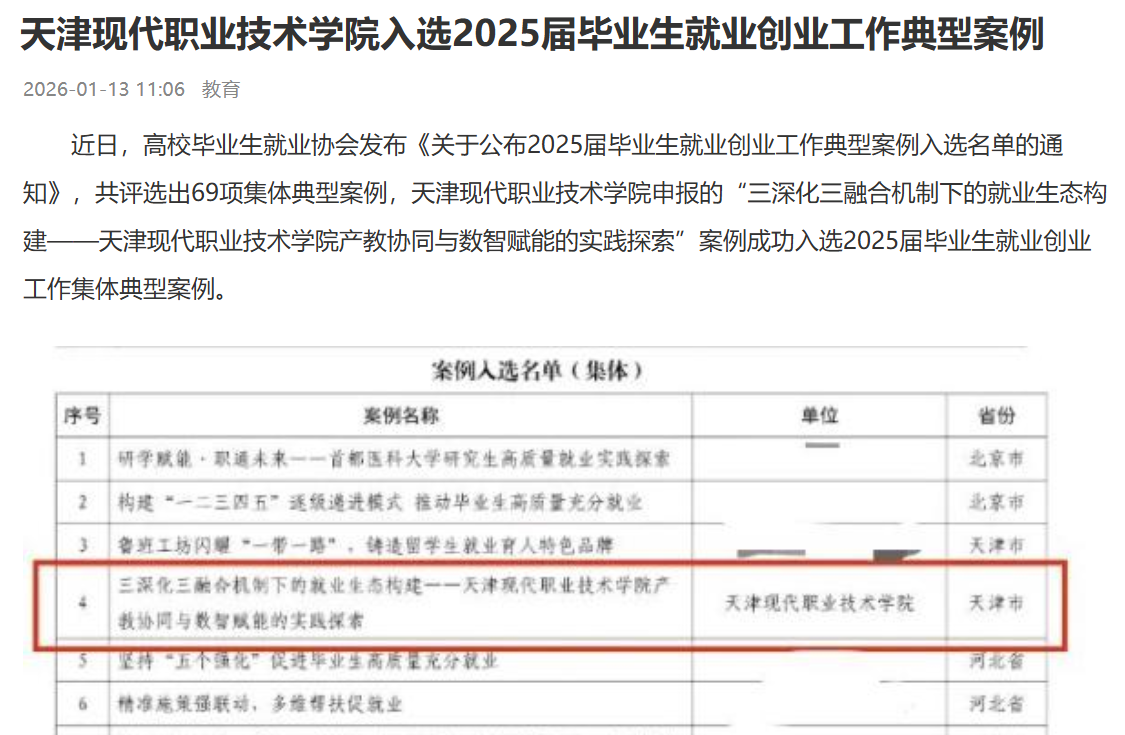 此次学院作为获此殊荣的天津市高职院校代表之一入选,充分体现了学院在推动就业育人工作方面的显著成效,对学院就业创业工作的充分肯定。学院将持续优化就业工作机制,强化数字赋能与精准服务,努力打造具有现代职教特色的高质量就业新范式,为培养高素质技术技能人才、服务区域发展作出更大贡献。