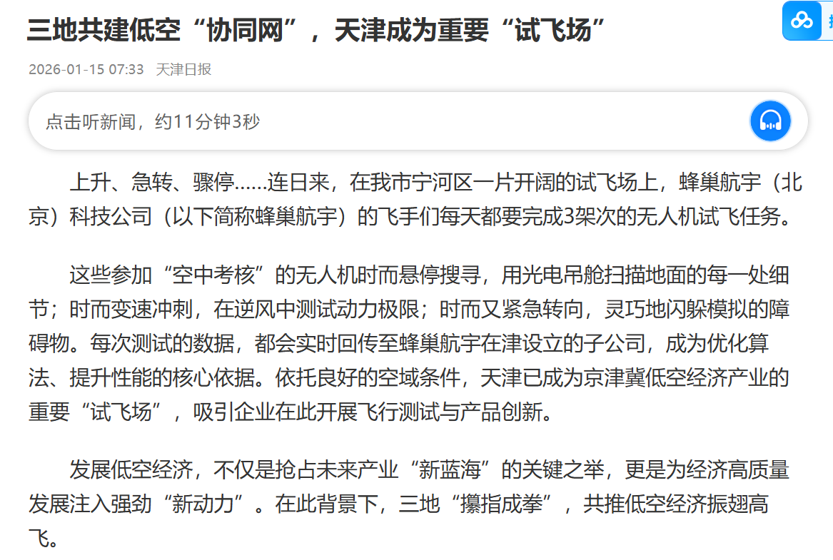 乘着低空经济发展的东风,京津冀通过资源共享与技术合作,加快构建跨区域低空协同体系。