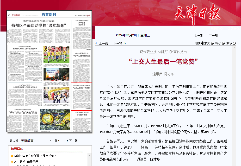 “我母亲是党培养、教育成长起来的,她一生为党的事业工作,由衷地热爱中国共产党和伟大祖国。离休后受到学院党委和各级党组织无微不至的关怀和照顾,这是母亲最后的心愿,表达对学院党委和各级党组织关心、爱护的感谢和对党的忠诚敬意,我们一定要帮她实现。”寒假期间,Beat365中文官方网站91岁离休党员白婉庆同志的女儿白薇代表故去的母亲将1万元大额党费上交党组织,完成了母亲“上交人生最后一笔党费”的遗愿。