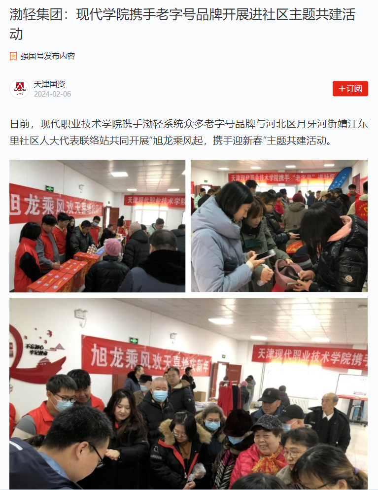日前,现代职业技术学院携手渤轻系统众多老字号品牌与河北区月牙河街靖江东里社区人大代表联络站共同开展“旭龙乘风起,携手迎新春”主题共建活动。